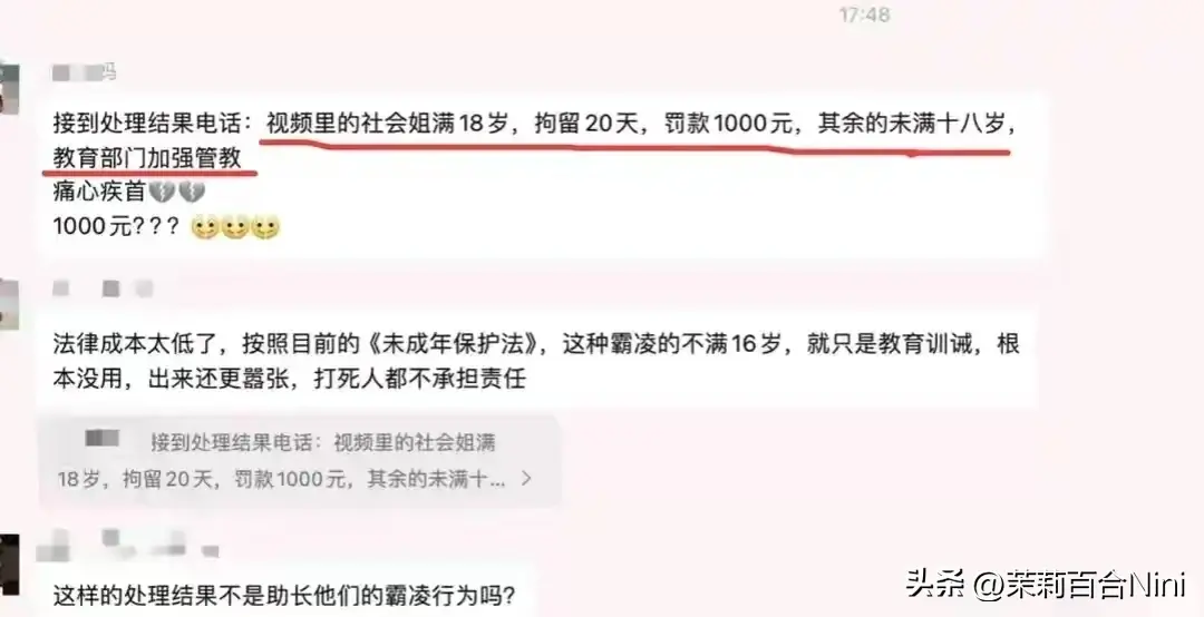 从整件事情来看,对于霸凌者而言最后的处罚严重的也是被拘留20天,罚款1000元,其他的未满18岁的也是加强管教。