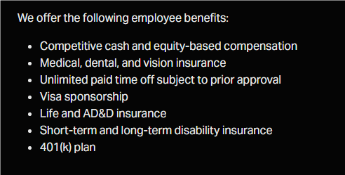 关于工作条件方面,xAI强调了全面福利政策,包括但不限于医疗、牙科和视力保险等项目,并且在获得批准的情况下可以享受无限期带薪休假。对于海外员工来说,公司还提供签证赞助。