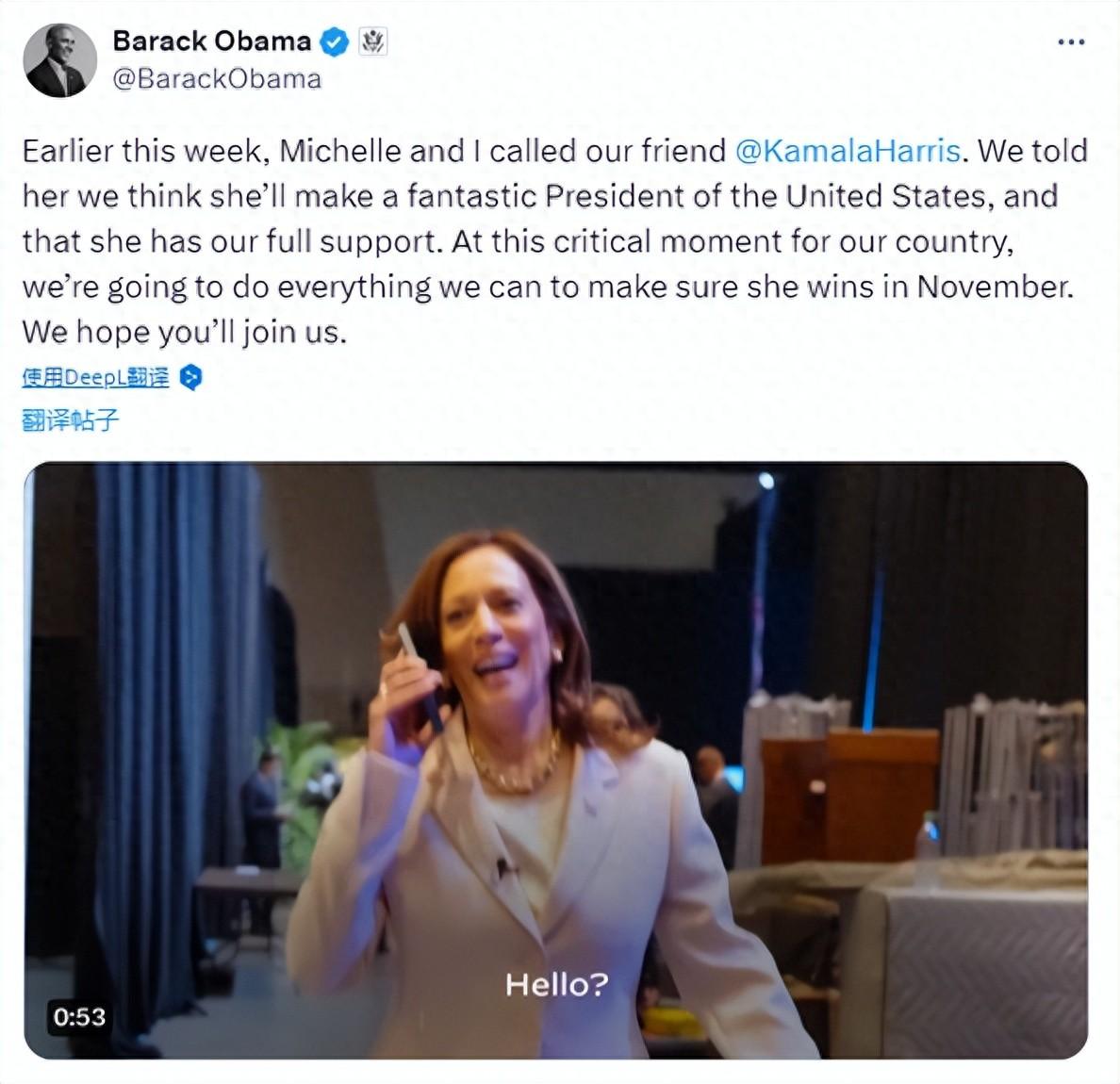 转载:https://www.toutiao.com/article/7395870715829895716/ 2024-07-26 17:16·界面快讯 美国前总统奥巴马7月26日表示,本周早些时候,他和米歇尔给哈里斯打了电话。他和米歇尔都认为哈里斯会成为一位出色的美国总统,并全力支持她。奥巴马说,“在这个国家的关键时刻,我们将竭尽全力确保她在11月获胜。”