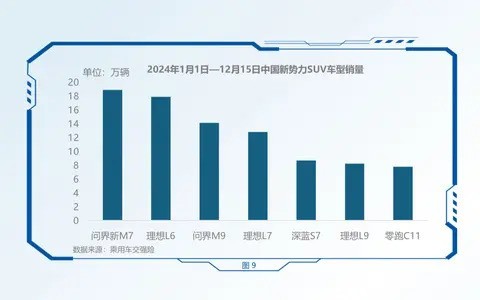 根据该报告数据,在2024年新势力SUV车型销量榜单中,问界新M7系列位居榜首。理想L6和问界M9分别位列第二和第三位。