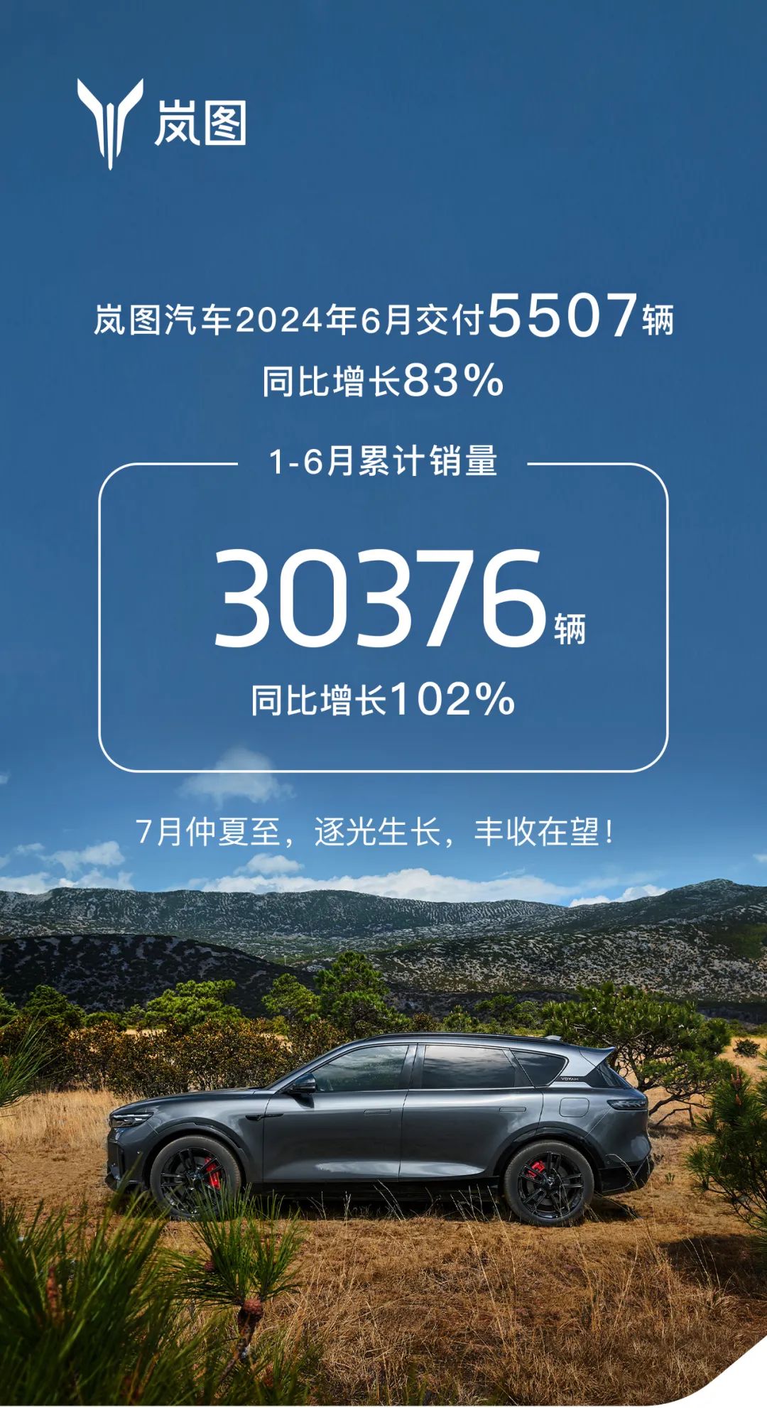 7月1日,岚图汽车公布了其6月份和今年上半年的销售业绩。数据显示,6月份交付了5507辆汽车,同比增长83%;1月至6月累计销量达到30376辆,同比增长102%。