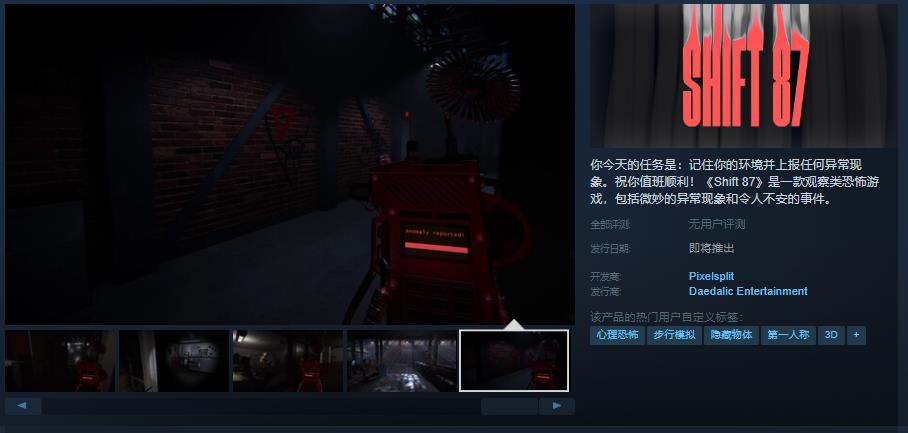 今日(7月9日),一款名为《轮班87》的恐怖游戏在Steam平台上架,该游戏支持简繁体中文,具体发售日期尚未确定。对此款游戏感兴趣的玩家可以直接前往商店页面获取更多信息。