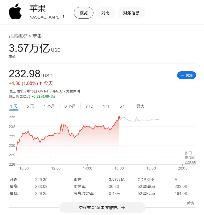 7月11日,苹果公司股价创下52周新高点,达到227.85美元,并在接下来的几天中继续创新高,盘中最高价达到233.08美元,开盘价为229.30美元,收盘价为232.98美元。这家全球知名的科技公司在市值上也取得了突破,达到了3.57万亿美元。这意味着它成为全球市值超过3.5万亿美元的公司之一。