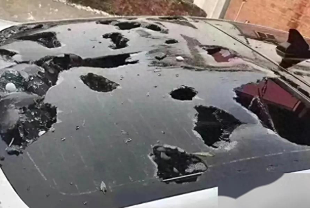 很快,不少停放在户外的车辆就遭到了冰雹的袭击,前挡风玻璃和车身多处被砸出深深的凹坑,场面惨不忍睹。