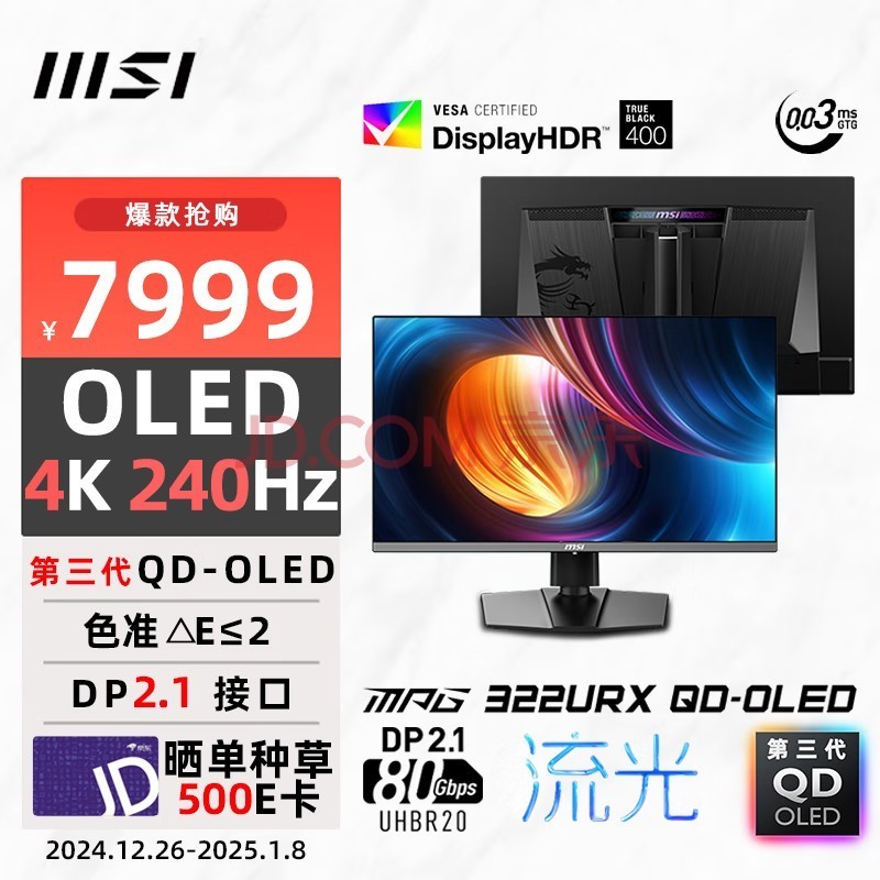 MPG322URXQD-OLED流光显示器预售活动将于12月26日于京东平台独家开启,用户只需支付预售定金即可锁定购买资格。而尾款支付时间则定于2025年1月1日晚上20:00开启。在价格方面,微星给出了极具竞争力的预售价格。用户预售到手价为7999元,晒单还可返500E卡,即晒单到手价格低至7499元。这样的价格对于一款拥有如此高性能的显示器来说,可谓是非常具有吸引力的。
